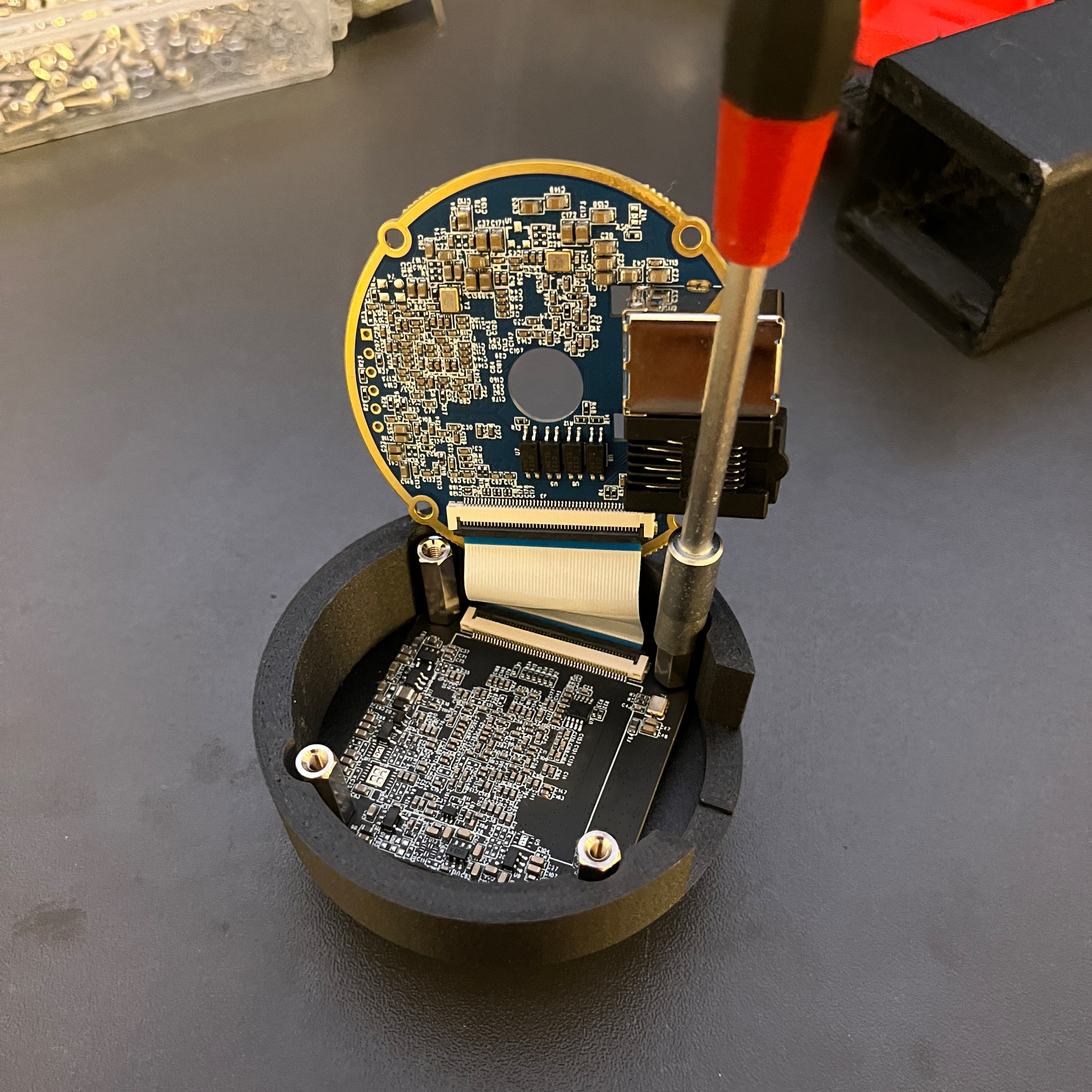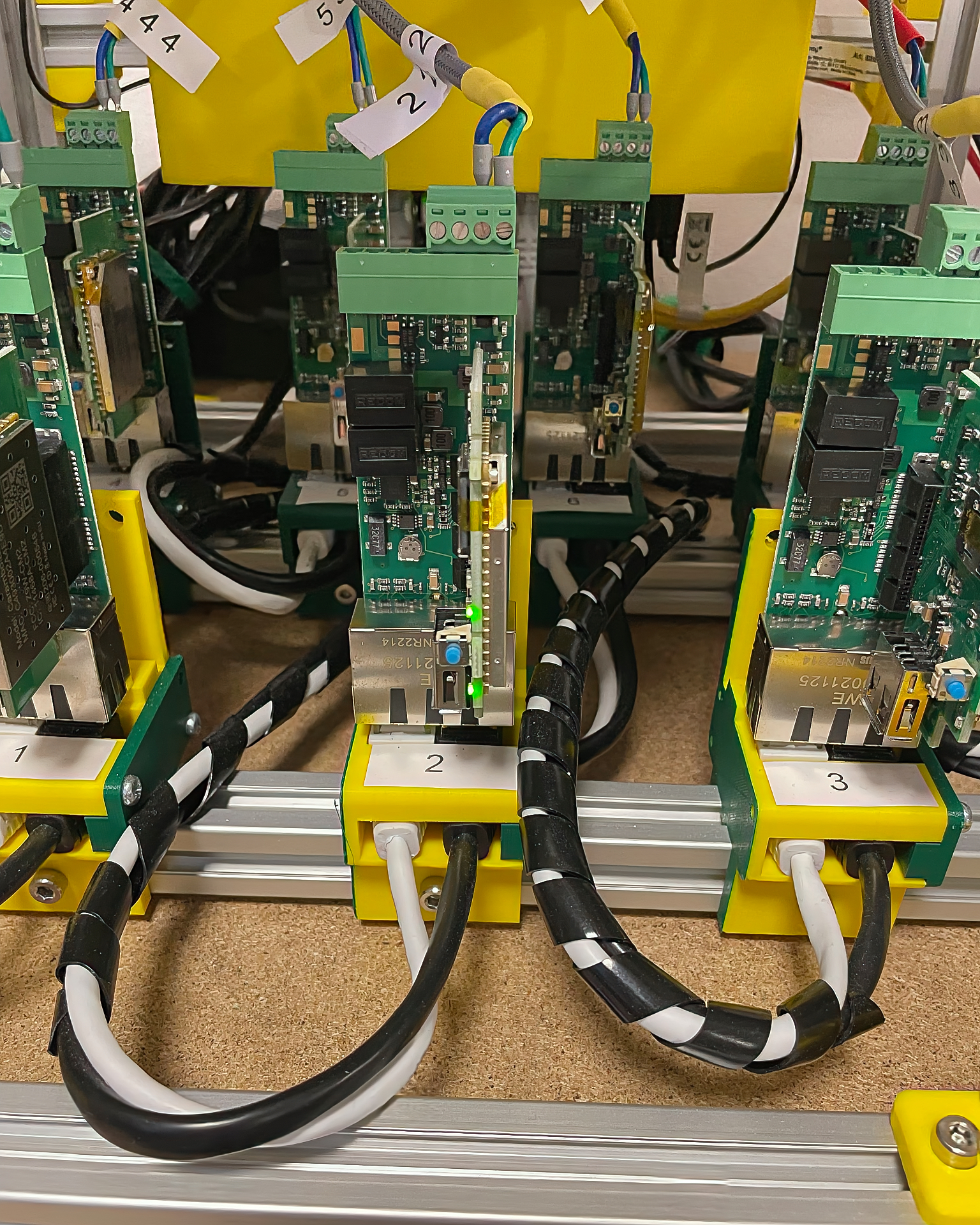Platinenbestückung erfolgt bei spezialisierten Partnern. Die Endmontage – Gehäuse, Verkabelung, Beschriftung – machen wir selbst.